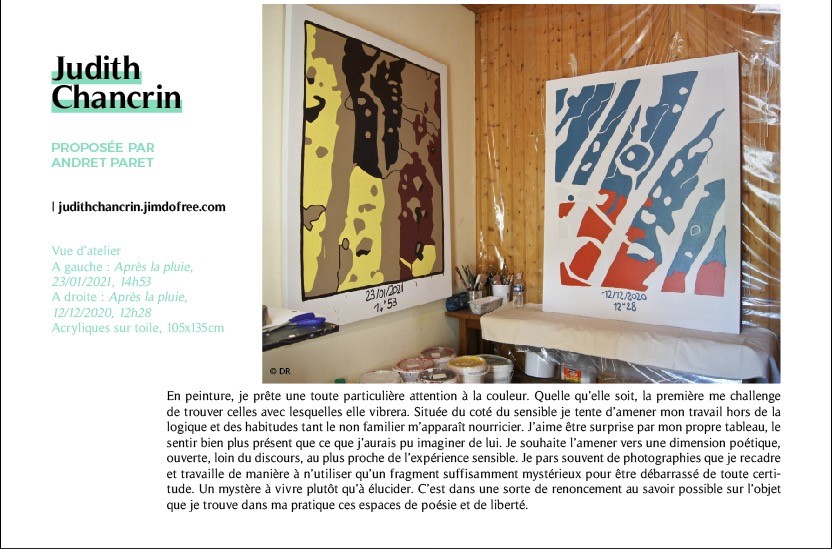 Judith Chancrin est une artiste française née en 1988 qui vit et travaille en Nord-Ardèche, près d'Annonay. A la suite d'un cursus littéraire, elle est Diplomée du DNAP en 2011 puis du DNSEP en 2013 à l'école des Beaux-Arts de Valence (26), formée ensuite en 2019 (certificat d'état RNCP niveau 2) chez Profac, centre de psychologie appliquée et d'art-thérapie contemporaine. Elle développe actuellement sa pratique artistique depuis son atelier, qui se déploie dans des formes variées telle que la peinture, l'assemblage, le collage, l'estampe et l'installation vidéo. Elle intervient de manière régulière où plus ponctuellement dans diverses structures, sur des projets artistiques auprès de différents publics. Qu'il s'agisse d'ateliers proposant une immersion au sein de son processus de travail, principalement orienté vers l'abstraction ainsi que la dimension sensible et poétique de l'objet, ou de réalisations de fresques. La forme de ses interventions est ouverte, adaptable et multiple.