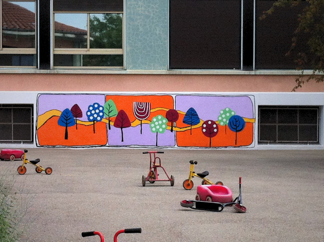 Intervention pour la réalisation de deux fresques pédagogiques à l'école Paul Langevin sur le thème des arbres et de la couleur, Roussillon (38), pour TEC (Travail et Culture), dispositif POOP, 2019.