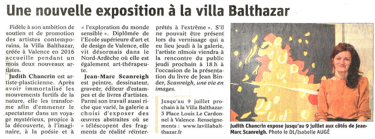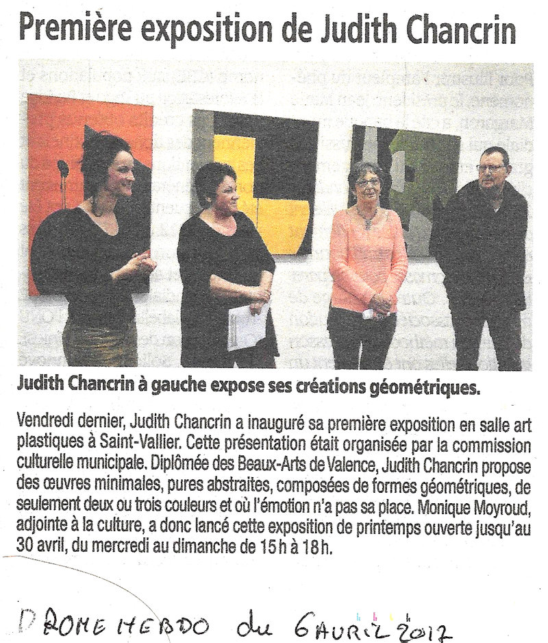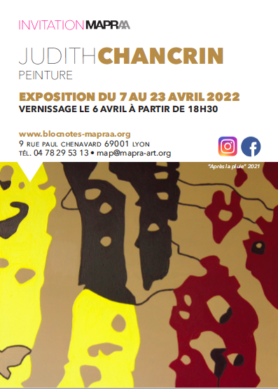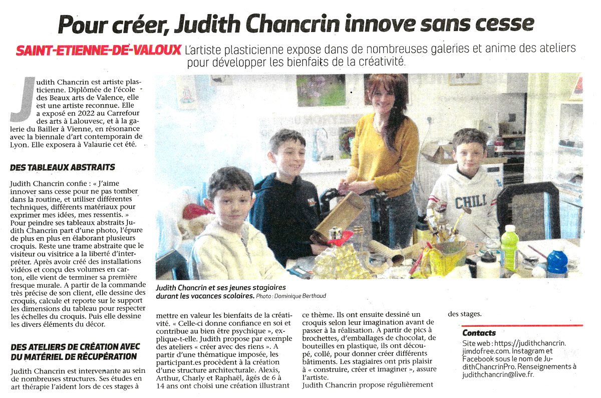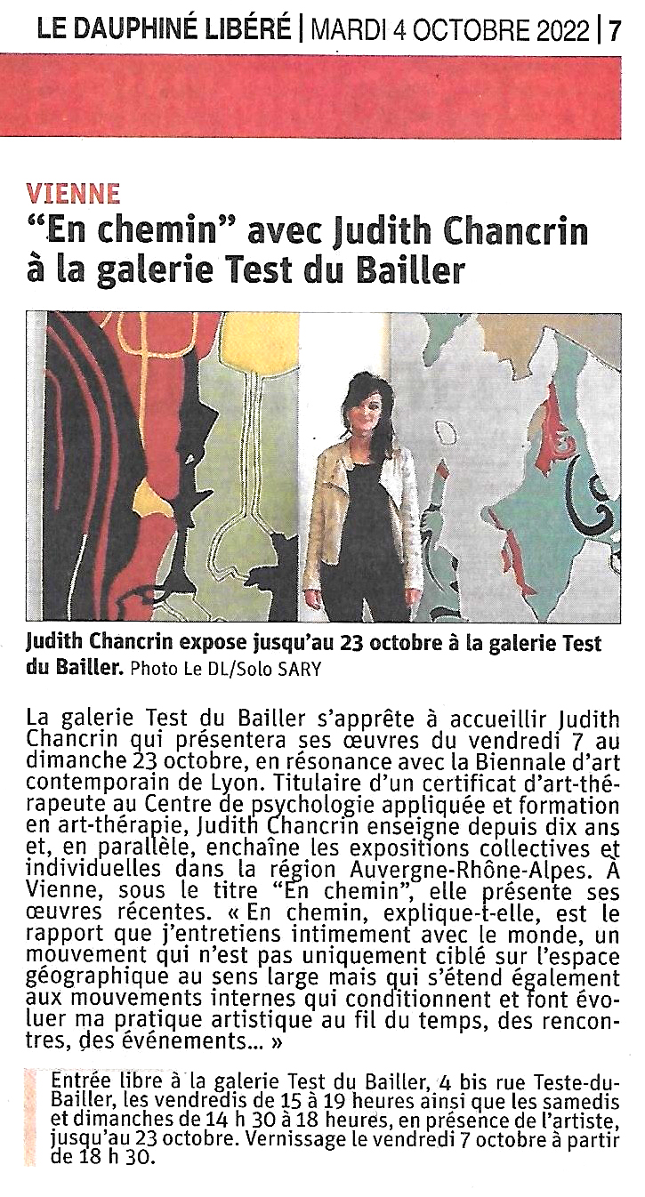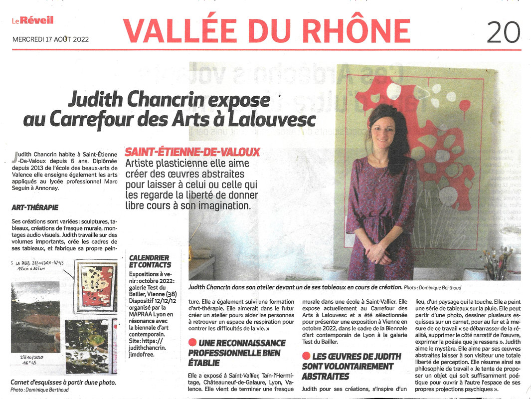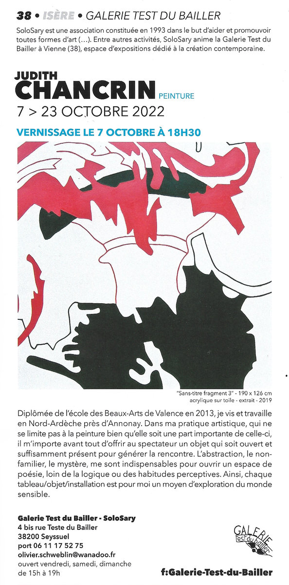 Judith Chancrin est une artiste française née en 1988 qui vit et travaille en Nord-Ardèche, près d'Annonay. A la suite d'un cursus littéraire, elle est Diplomée du DNAP en 2011 puis du DNSEP en 2013 à l'école des Beaux-Arts de Valence (26), formée ensuite en 2019 (certificat d'état RNCP niveau 2) chez Profac, centre de psychologie appliquée et d'art-thérapie contemporaine. Elle développe actuellement sa pratique artistique depuis son atelier, qui se déploie dans des formes variées telle que la peinture, l'assemblage, le collage, l'estampe et l'installation vidéo. Elle intervient de manière régulière où plus ponctuellement dans diverses structures, sur des projets artistiques auprès de différents publics. Qu'il s'agisse d'ateliers proposant une immersion au sein de son processus de travail, principalement orienté vers l'abstraction ainsi que la dimension sensible et poétique de l'objet, ou de réalisations de fresques. La forme de ses interventions est ouverte, adaptable et multiple.