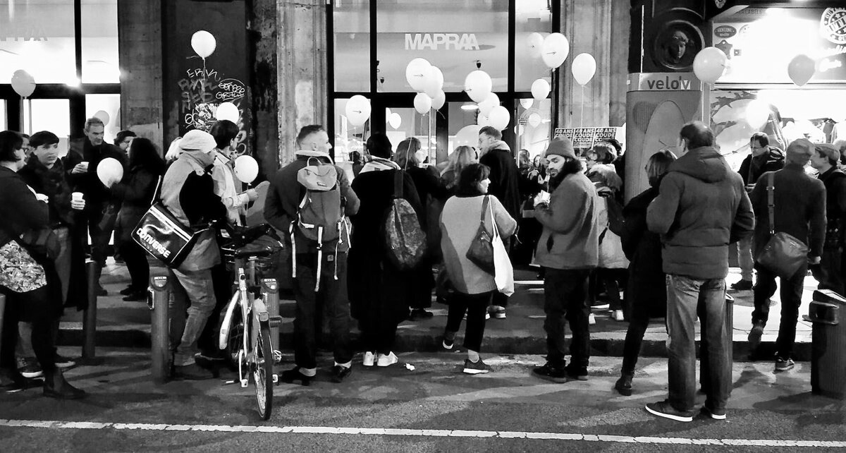 Exposition collective de soutien à la MAPRAA contre son expulsion des locaux au 7 rue Paul Chenavard, Lyon 1er - 40 artistes sont venus soutenir l'association lors de leur dernier évènement. Une performance de Mr Bidule à clôturé l'exposition. Février 2024.