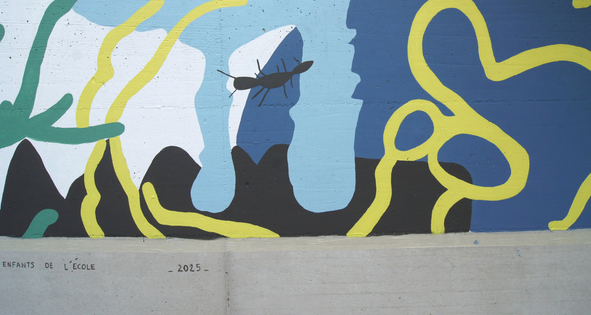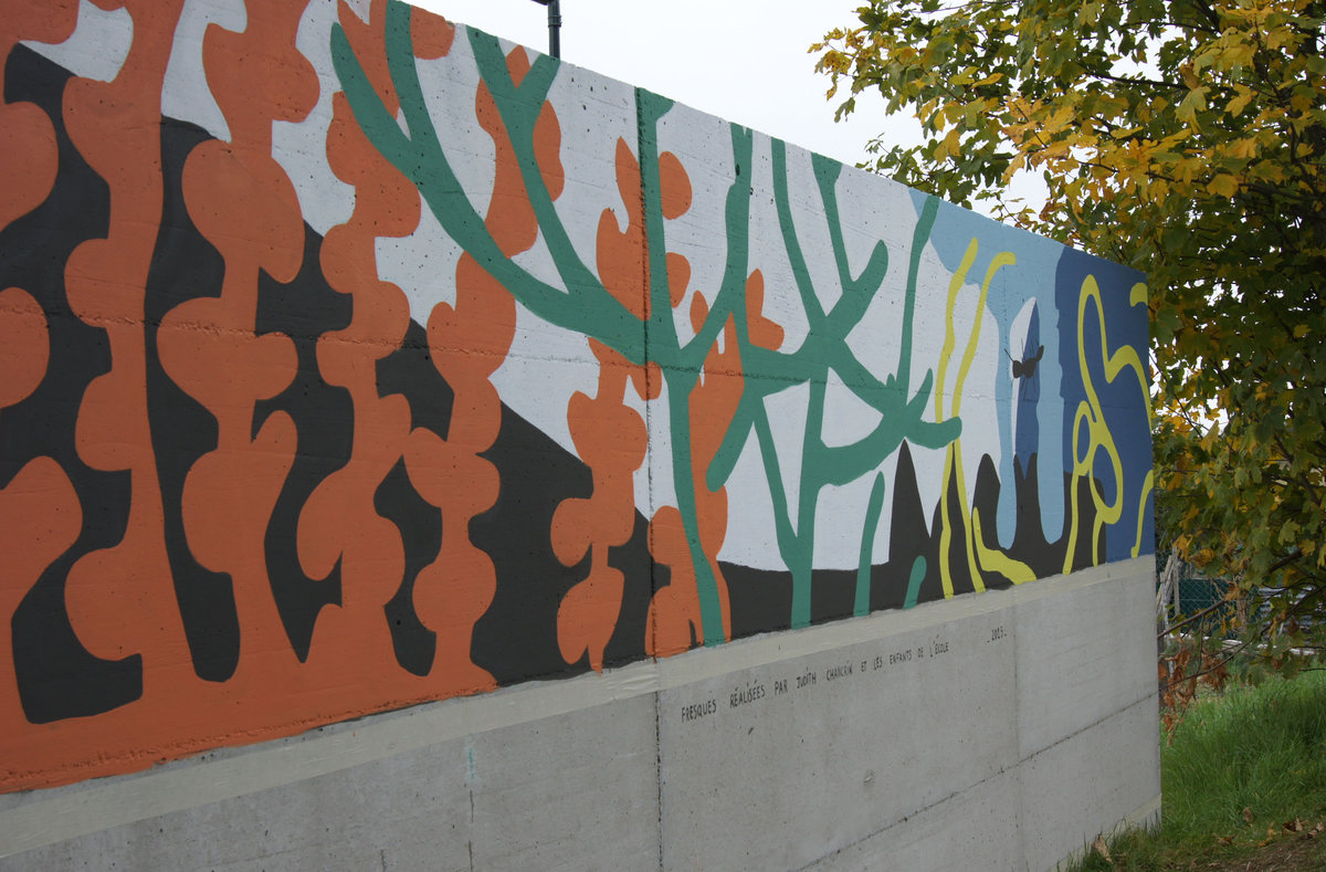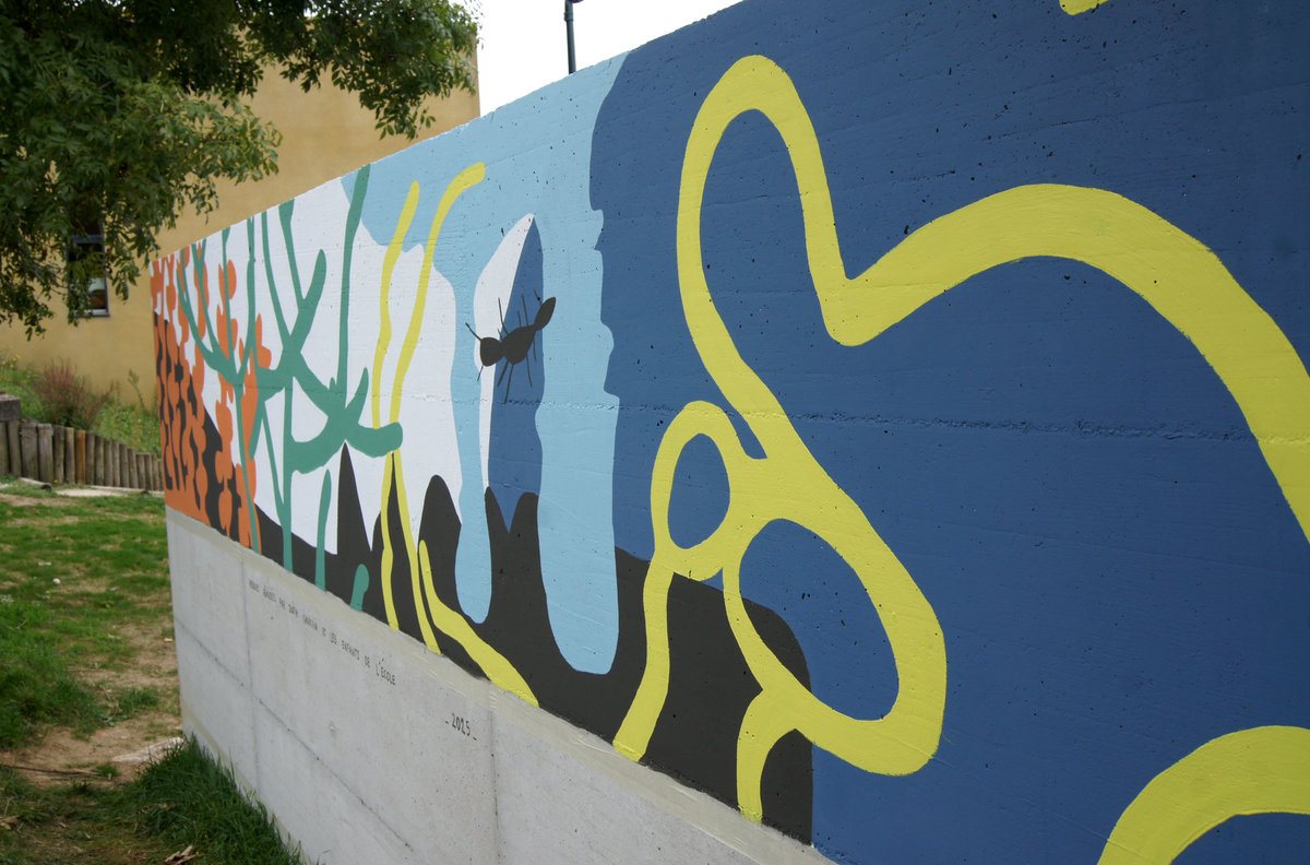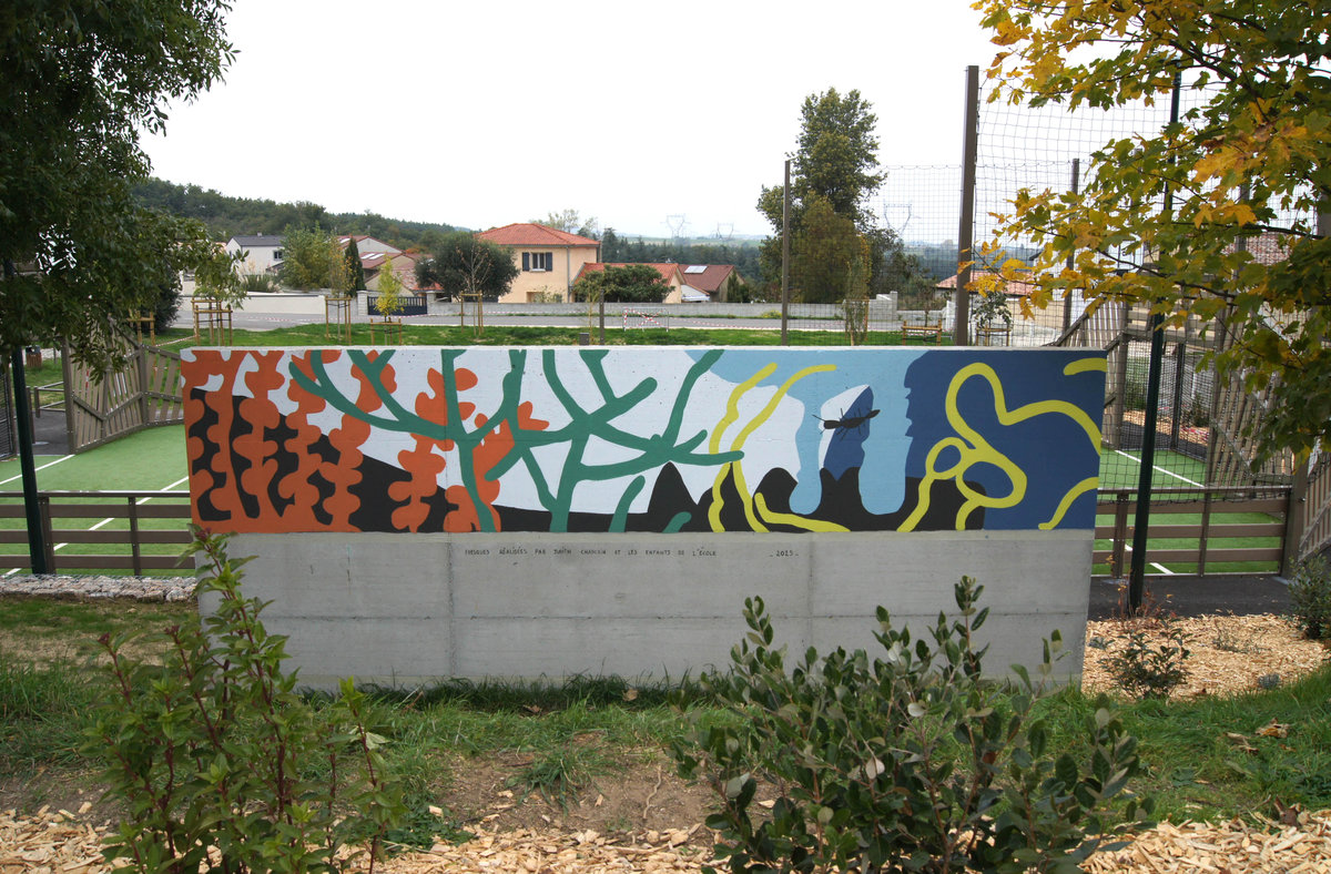 Réalisation d'une fresque au city stade de Lemps (07), en collaboration avec les enfants de l'école de la commune. Le visuel à été conçu à partir des graphismes réalisés par les enfants lors de précédentes interventions.