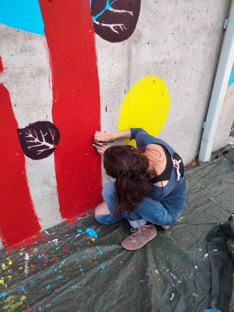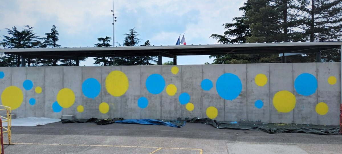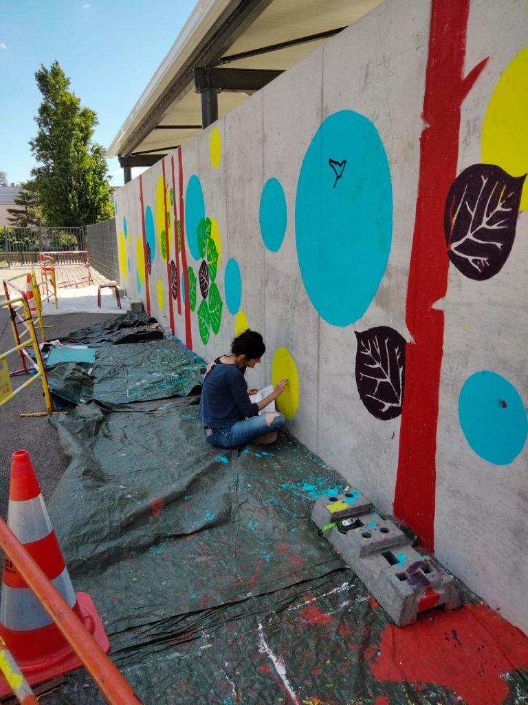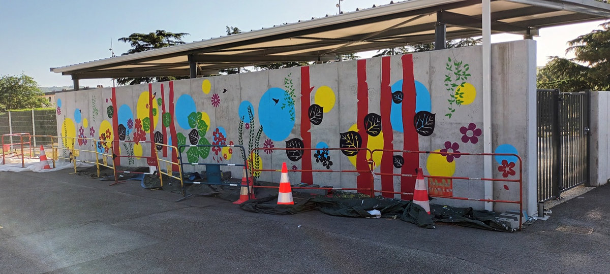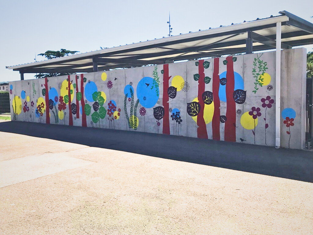 Réalisation d'une fresque pédagogique au sein de l'école Gisèle Halimi à Saint-Vallier sur Rhône. Ici, j'ai été invitée à réaliser un visuel sur le thème de la couleur et de la nature, (graphiquement accessible aux enfants) puis de pré-tracer le projet sur le mur afin que l'équipe pédagogique puisse amener les enfants à la peinture de celui-ci.