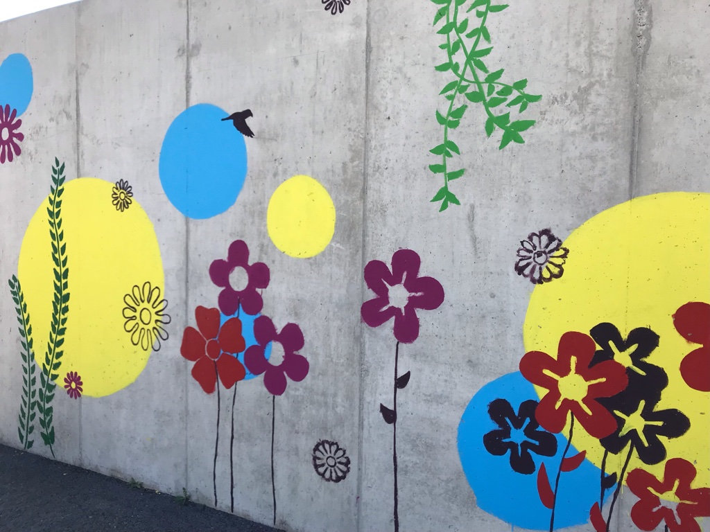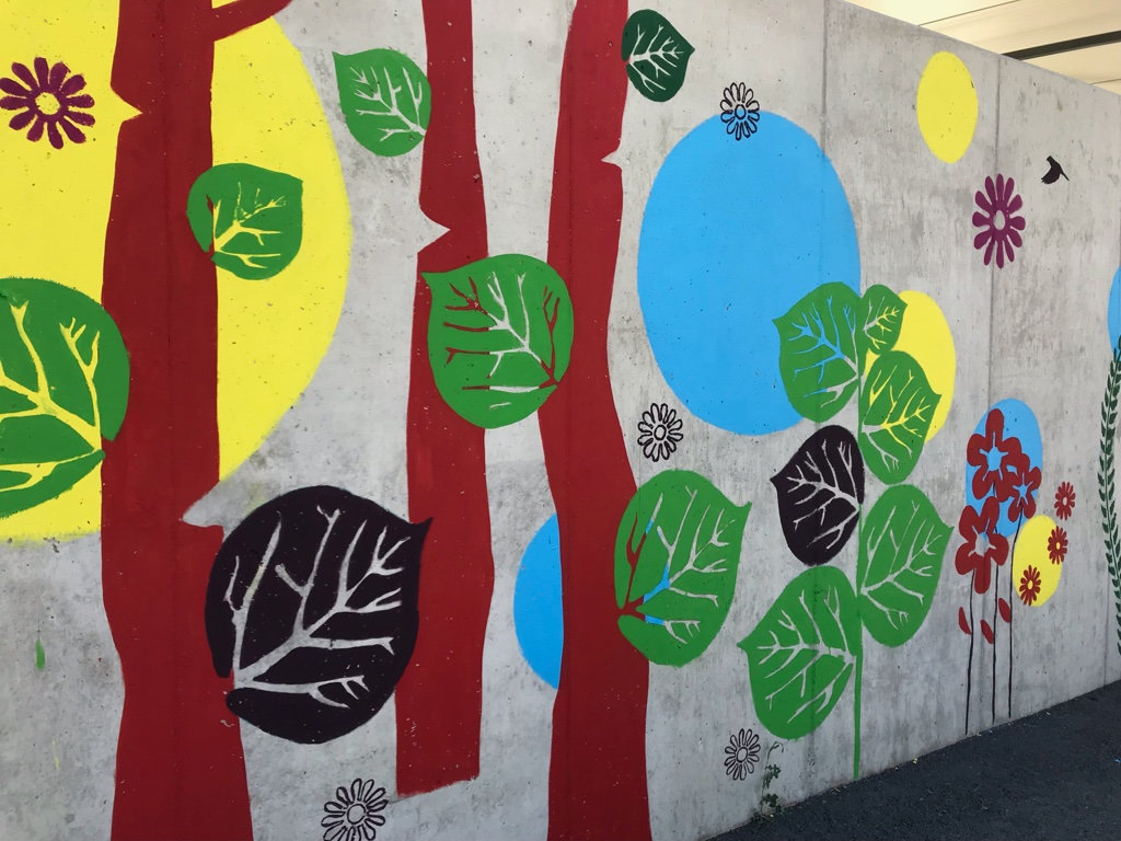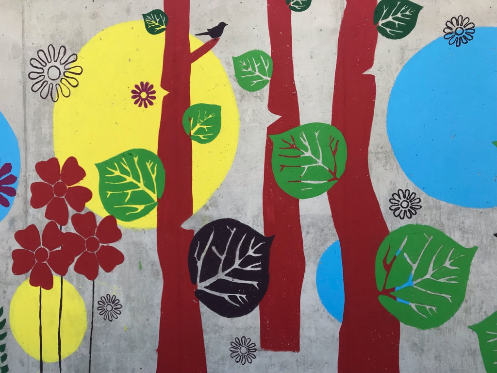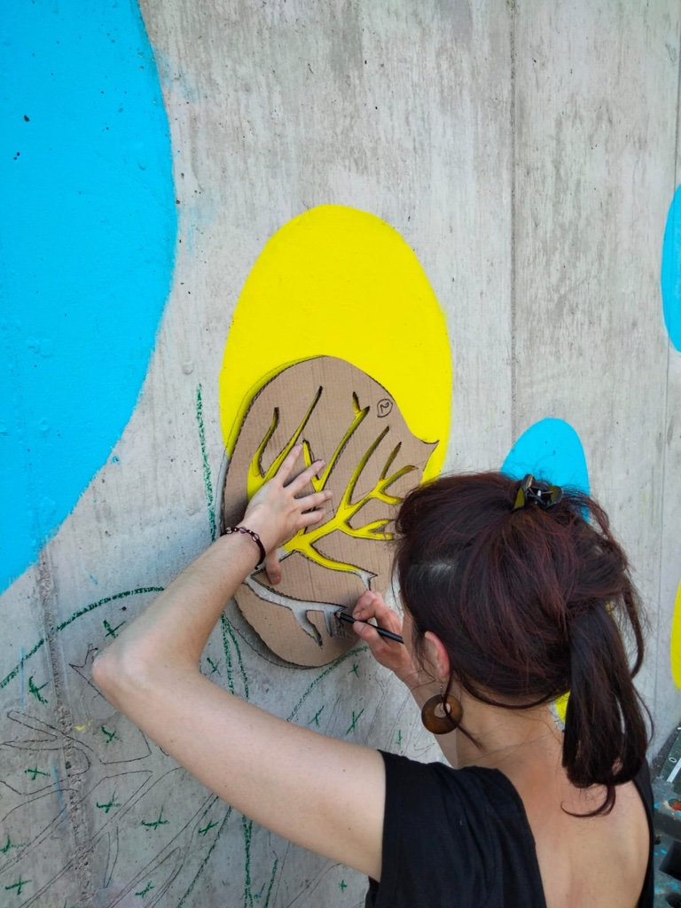Réalisation d'une fresque pédagogique au sein de l'école Gisèle Halimi à Saint-Vallier sur Rhône. Ici, j'ai été invitée à réaliser un visuel sur le thème de la couleur et de la nature, (graphiquement accessible aux enfants) puis de pré-tracer le projet sur le mur afin que l'équipe pédagogique puisse amener les enfants à la peinture de celui-ci.