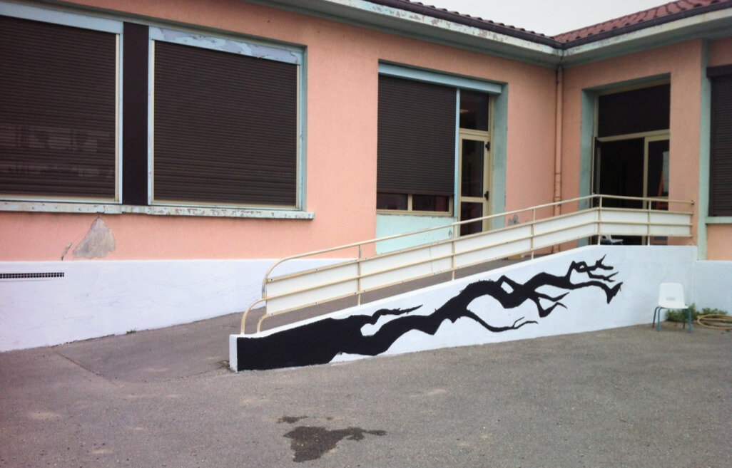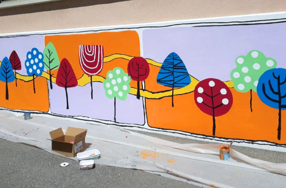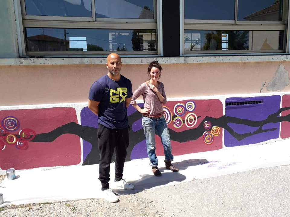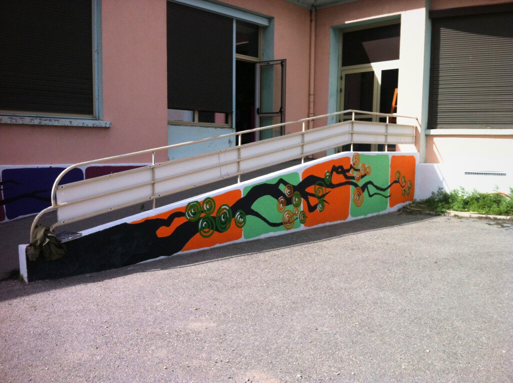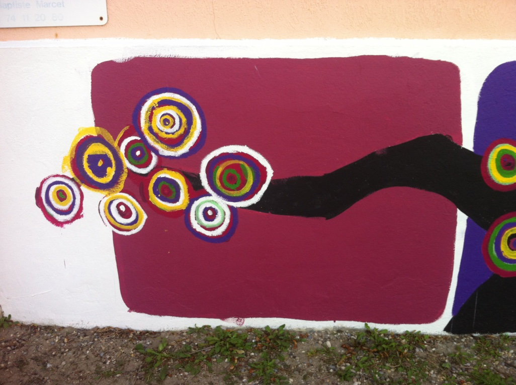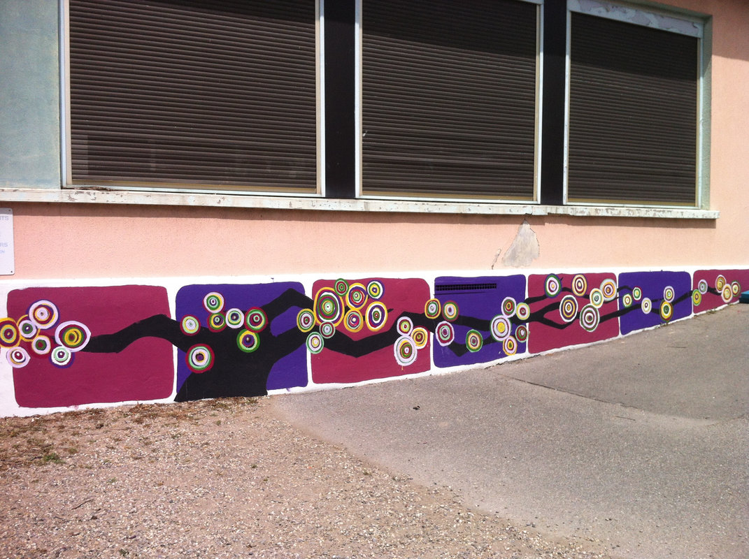 Intervention pour la réalisation de deux fresques pédagogiques à l'école Paul Langevin sur le thème des arbres et de la couleur, Roussillon (38), pour TEC (Travail et Culture), dispositif POOP, 2019.