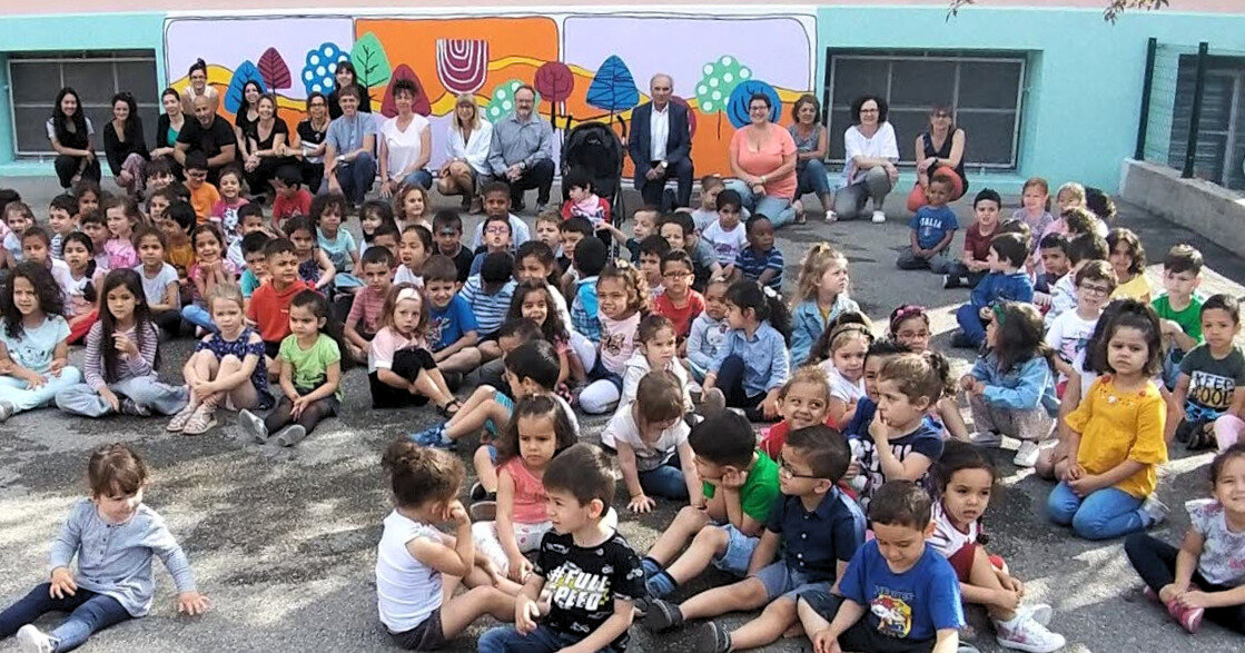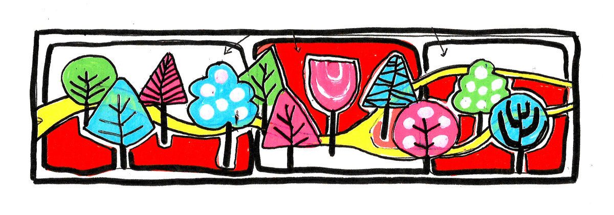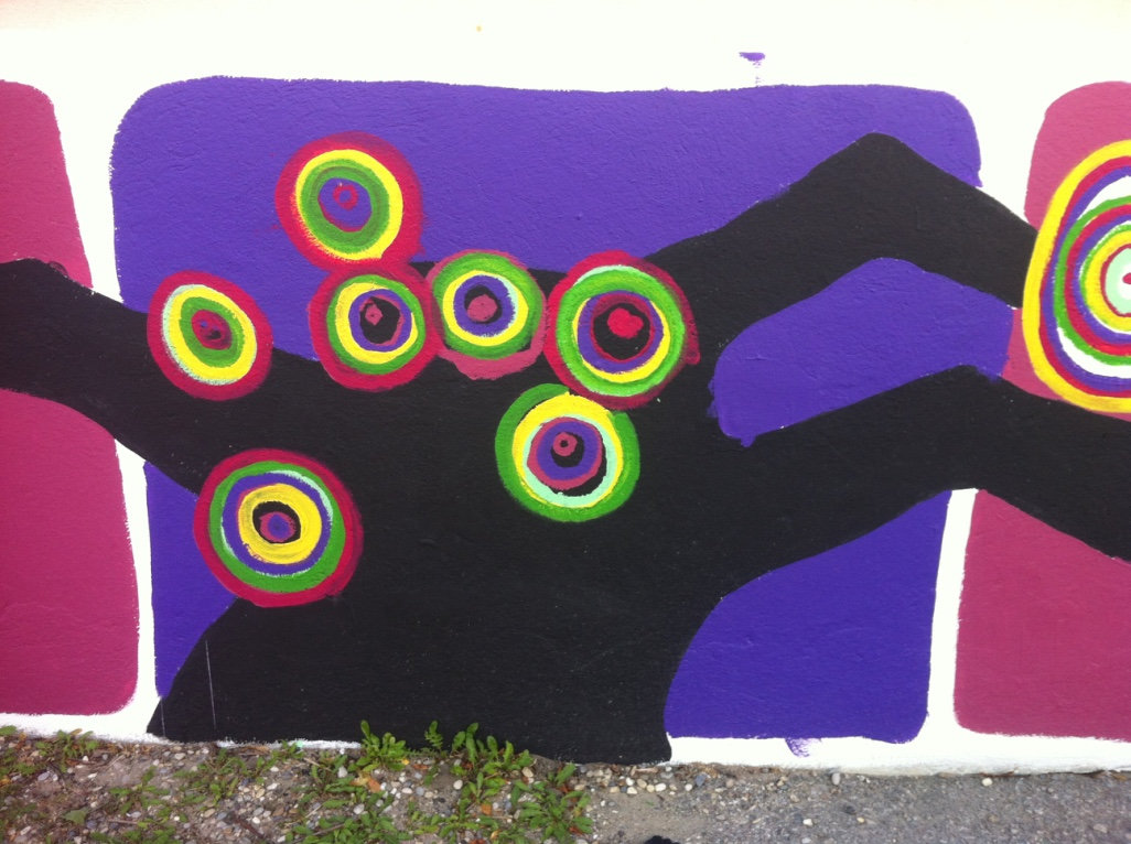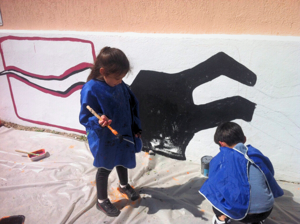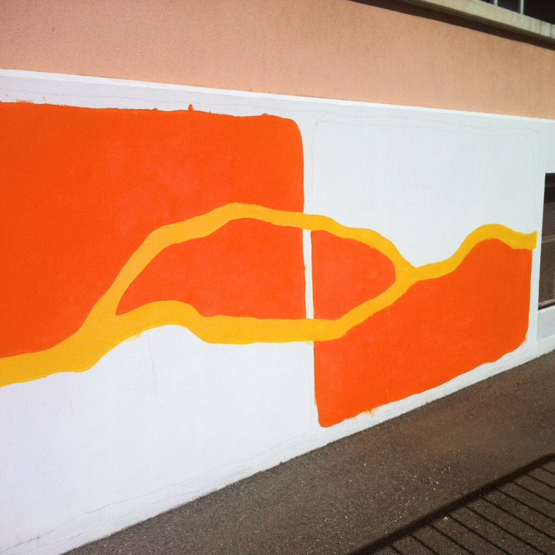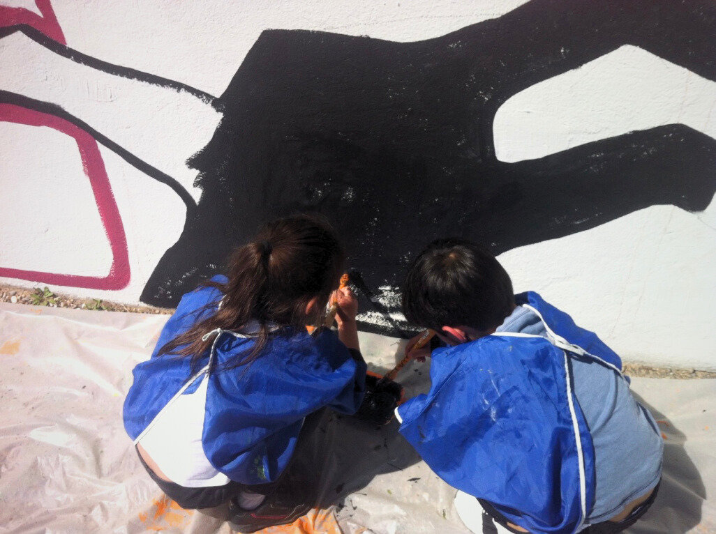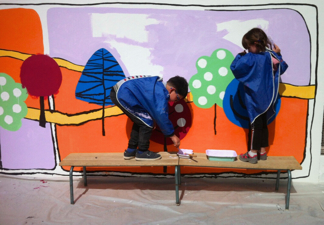 Intervention pour la réalisation de deux fresques pédagogiques à l'école Paul Langevin sur le thème des arbres et de la couleur, Roussillon (38), pour TEC (Travail et Culture), dispositif POOP, 2019.