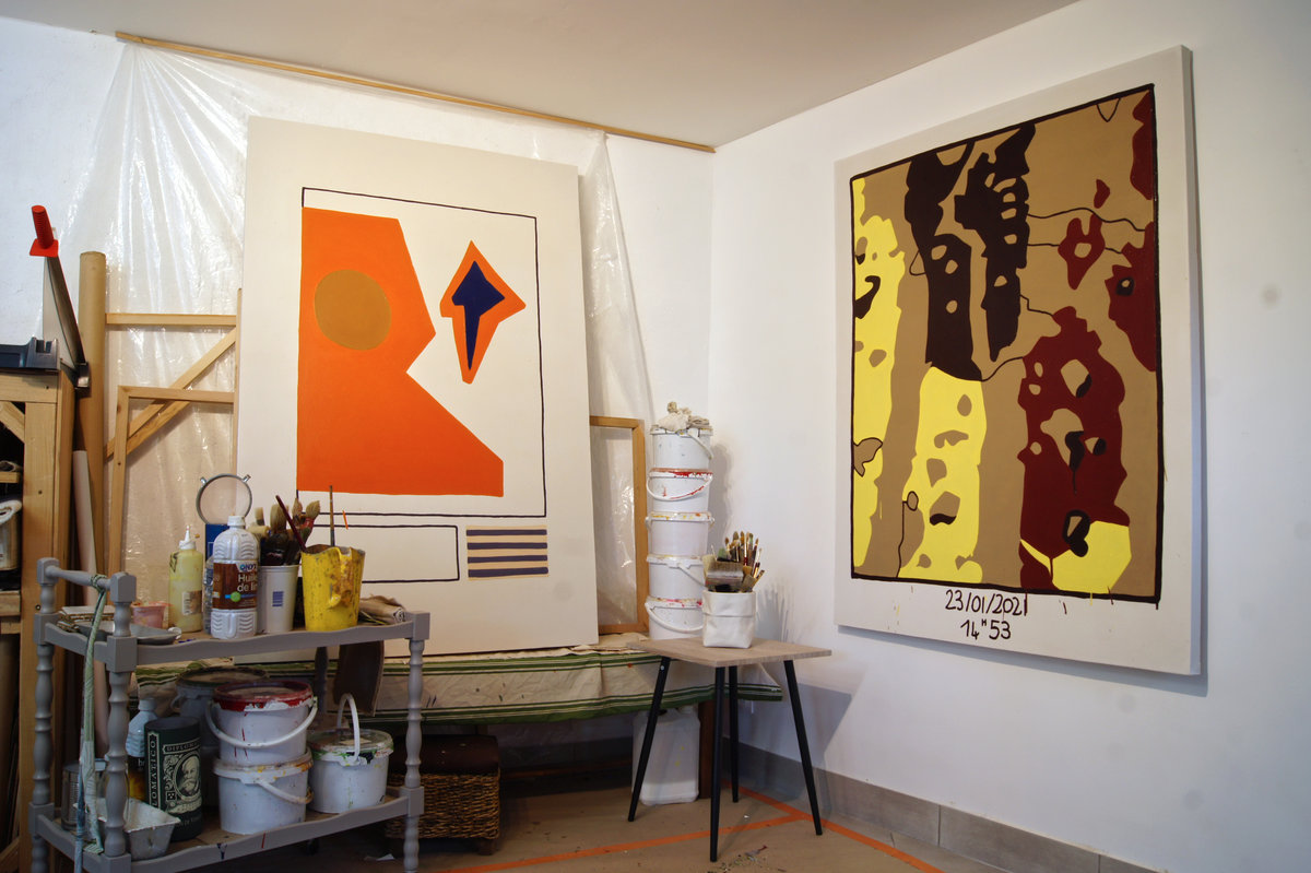 Ce début de série en peinture questionne la composition dans l'espace de la toile. Les changements de médiums et l’agrandissement me servent à observer les caractéristiques de ses points de passages, de ses transformations vécues d’un état à l’autre, d’une condition à une autre. Je recherche souvent une image hybride des techniques de production de celle-ci. Non pas dans la matière même du tableau mais dans le rapport de la feuille au papier confronté à celui du rapport entre la toile et le pinceau, à celui du crayon et de l’espace. Par ces dispositifs, j’essaie de me détacher des logiques d’appréhension de la composition.