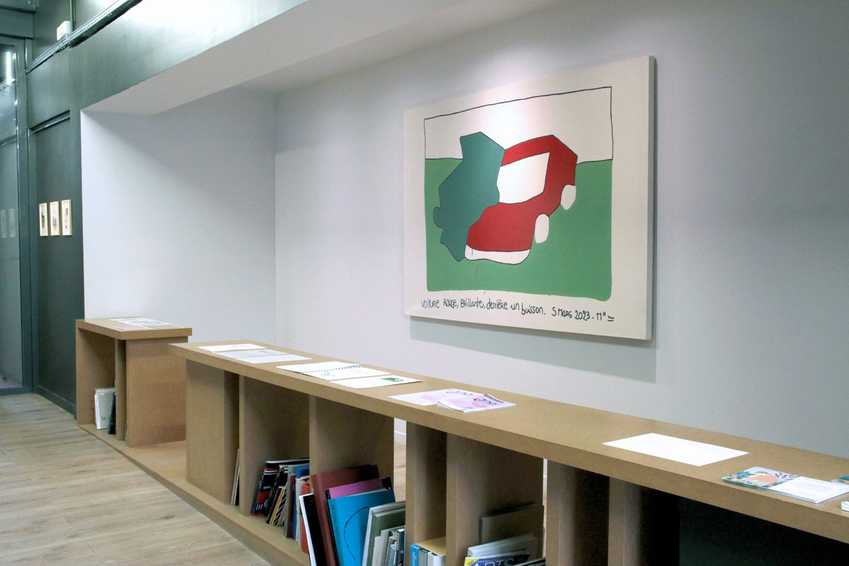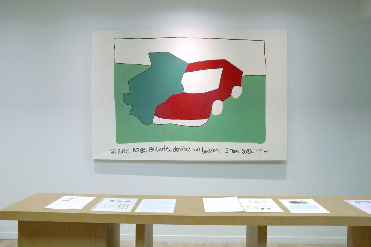 Voiture rouge brillante, derrière un buisson, 5 Mars 2023, 11h environs, est un tableau solitaire* né du désir de renverser mes propres habitudes de création, c’est mon premier tableau dit «figuratif» et orienté horizontalement. Conçu dans une grande légèreté et de la dérision. «Voiture rouge brillante derrière un buisson, 5 Mars 2023, 11h environs» a pris sa source dans une image mentale avec l’intention de jouer avec le contraste fini, non fini, en transposant au rang du tableau et de la peinture la première ébauche, très grossière et très spontanée qui peut surgir dans mon processus habituellement sur un simple bout de papier.